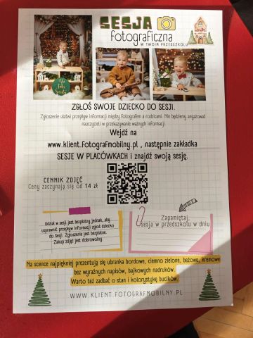 W dniu 18 listopada (wtorek) po śniadaniu odbędzie się świąteczna sesja fotograficzna wykonana przez Pana fotografa Bartosza Ścianę, który proponuje ubrać dzieci w odpowiednie kolory ubrań oraz bucików. Informacje na zdjęciu ulotce.