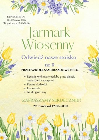Zapraszamy wszystkich na nasze stoisko nr 8 z ozdobami, dekoracjami, słodkościami i lemoniadą na JARMARKU WIOSENNYM pt:"Kolory Wiosny" w dniu 29 marca od godz. 12 do 20