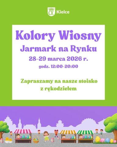 Szanowni Państwo. Serdecznie ZAPRASZAMY do udziału w Jarmaku "KOLORY WIOSNY", który odbedzie się na kieleckim rynku w dniach 28-29 marca 2026 roku, podczas którego będzie wiele atrakcji i zabaw dla dzieci z całymi rodzinami. Udział naszego przedszkola został wyznaczony na jeden dzień tj, 29 marca w niedzielę od 12 do 20 godziny. Nasze przedszkole będzie miało swoje stoisko oznaczone PS nr 42 oraz o godz. 15.45 dzieci z grupy II ŻABKI wystąpią na artystycznej scenie z ...