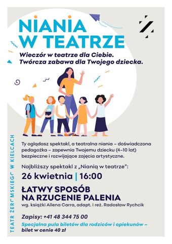 Szanowni Państwo. Teatr im. Stefana Żeromskiego w Kielcach zwraca się z uprzejmą prośbą o przekazanie rodzicom i opiekunom dzieci informacji o inicjatywie „Niania w teatrze", organizowanej właśnie przez Teatr im. Stefana Żeromskiego. W ramach tego projektu, podczas wybranych spektakli, zapewniamy profesjonalną opiekę artystyczno-edukacyjną dla dzieci w wieku 4–10 lat, prowadzoną przez doświadczoną pedagożkę.